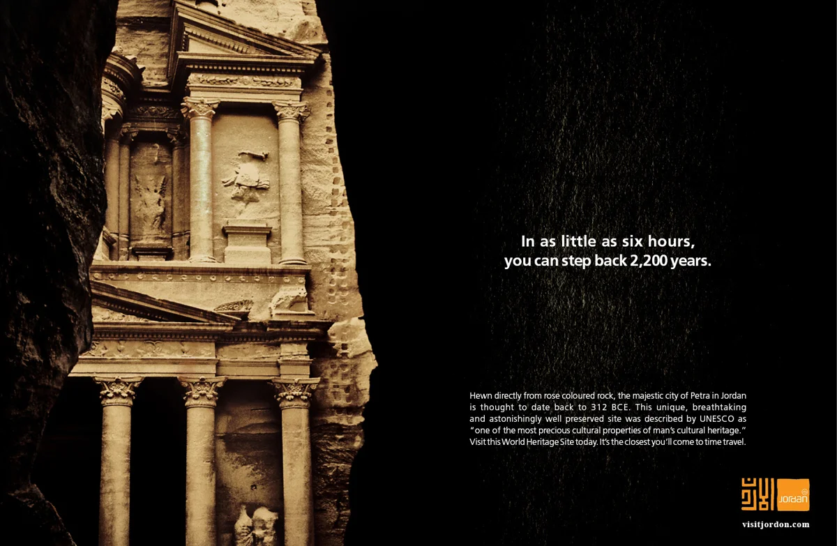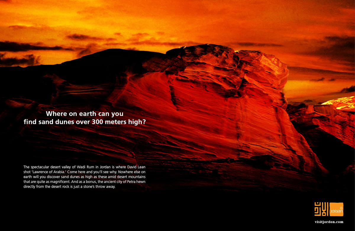 These press ads promoted Jordan as a tourist destination by featuring the country’s geographical and archaeological highlights (Wadi Rum and Petra) that make it one of the genuine wonders of the world. Capturing this stunning sunset in the blindingly hot desert and cold temperatures of dusk was certainly not the easiest of tasks.