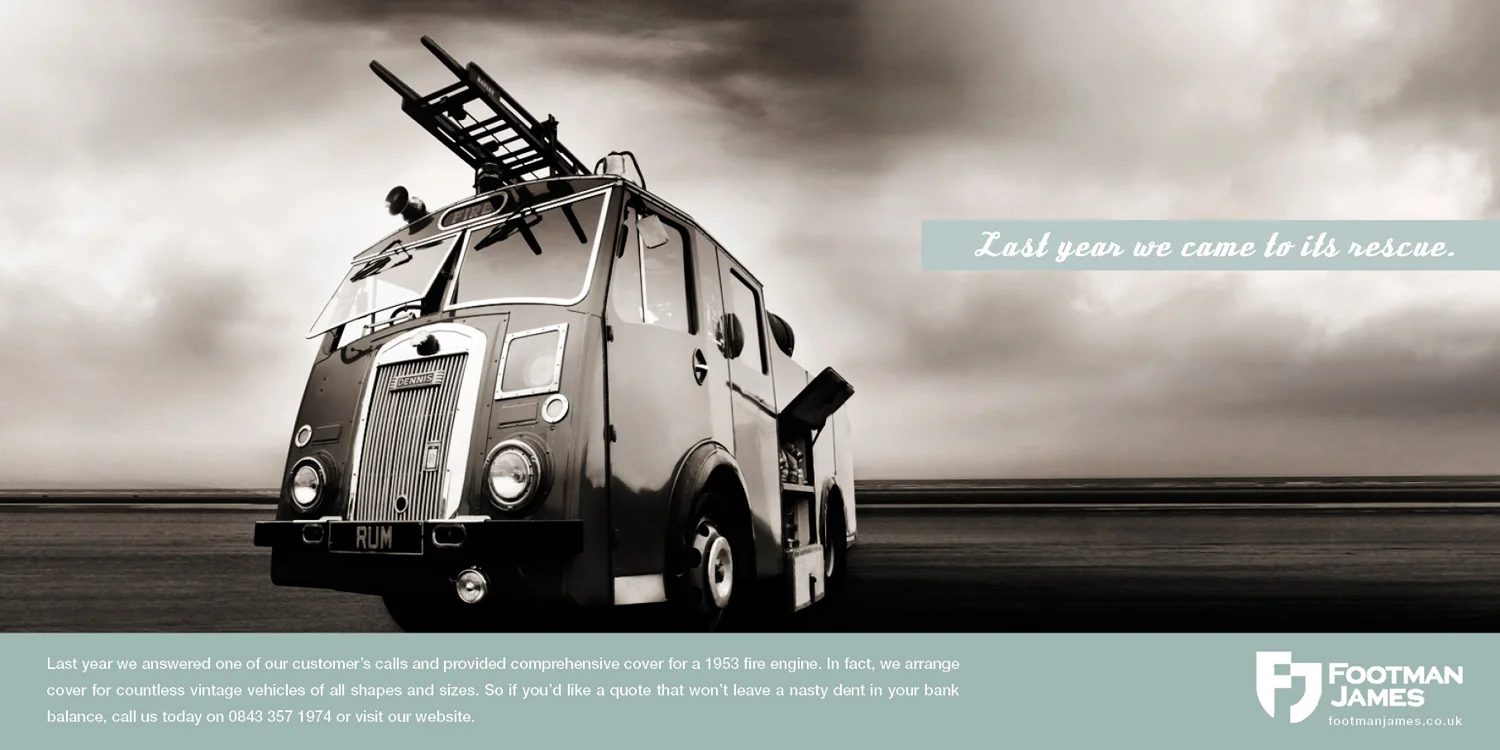 Footman James is one of the UK’s oldest specialist motor insurers, specialising in classic and vintage cars. Their customers are passionate about their vehicles, so the company wanted to reflect this passion in a series of advertisements with high production values. With this in mind, I decided to shoot the two vehicles in daylight on the beach at Camber Sands. While big skies can work wonders for the lighting, beaches and classic motor vehicles are not the best of bed-fellows. So I had to employ a transporter to place the vehicles exactly where I wanted them and then sweep the sand to remove any traces of tyre tracks. It was a bit of a performance to say the least but what fun and the results created a great feeling of nostalgia with these wonderful vehicles.